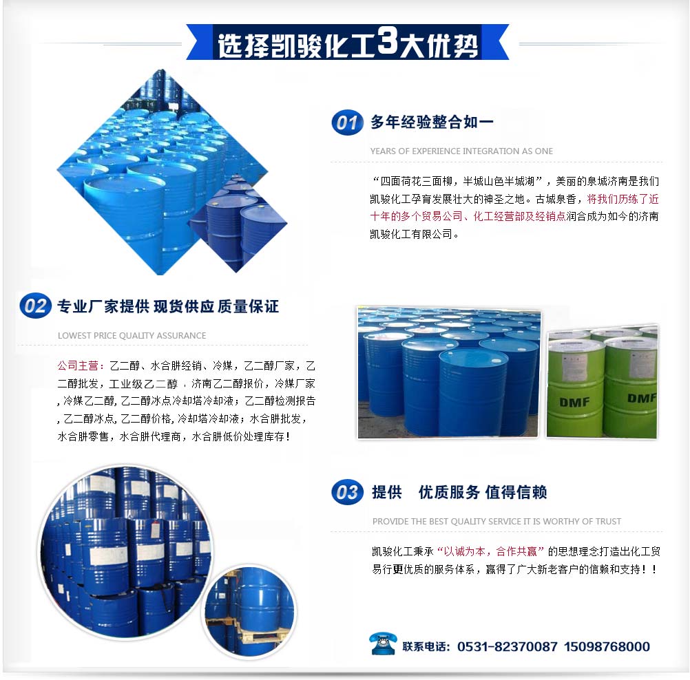 “四面荷花三面柳,半城山色半城湖”,美麗的泉城濟(jì)南是我們凱駿化工孕育發(fā)展壯大的神圣之地。古城泉香,將我們歷練了近十年的多個(gè)貿(mào)易公司、化工經(jīng)營(yíng)部及經(jīng)銷(xiāo)點(diǎn)潤(rùn)合成為如今的濟(jì)南凱駿化工有限公司。凱駿化工秉承“以誠(chéng)為本,合作共贏(yíng)”的思想理念打造出化工貿(mào)易行優(yōu)質(zhì)的服務(wù)體系,贏(yíng)得了廣大新老客戶(hù)的信賴(lài)和支持??! 主營(yíng):乙二醇、水合肼經(jīng)銷(xiāo)、...